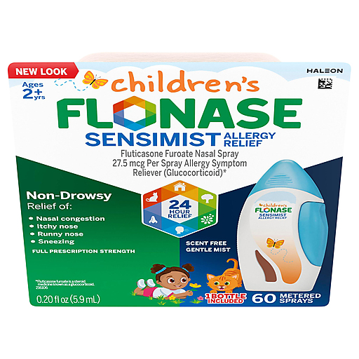 Flonase Sensimist Allergy Relief Spray for Children relieves kids' worst allergy symptoms with a gentle mist they will barely feel. Unlike most allergy medicines, Children's Flonase Sensimist relieves your child’s worst symptoms, including runny nose, sneezing, itchy nose, itchy eyes, watery eyes, sinus discomfort and nasal congestion.* This children's allergy medicine has a specially designed bottle with a smaller nozzle for kids’ noses and patented Mist-Pro technology to deliver the allergy medicine, fluticasone furoate, in an ultra-fine mist that is scent free and virtually drip free. The non drowsy allergy medicine for kids is formulated for more complete allergy relief to keep kids energized and focused throughout the day. Children's Flonase Sensimist 24 hour allergy medicine for kids is formulated for daily use in children ages 2 to 11 years. To use: once daily, place the small nozzle tip inside your child's nose and spray gently. Have them breathe out through their mouth, then repeat in the other nostril.