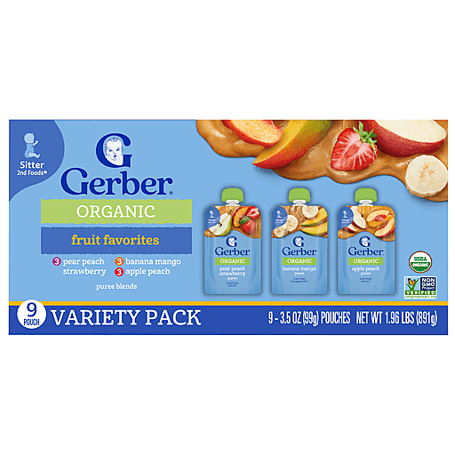 Our Gerber Organic Fruit Favorites Puree Pouches Variety Pack is crafted with wholesome ingredients and strict quality standards just for babies, making them a premium choice for your little one. These stage 2 Gerber baby food pouches are designed for babies who are 6 months + and are ready to explore new textures and flavors, making them a great addition to your baby's diet. Gerber baby food understands the importance of providing wholesome food as your baby grows and develops, that’s why these purees are made with real fruits. These organic baby food fruit pouches are Non-GMO Projected Verified and are an ideal choice for parents who seek quality in their baby's diet.