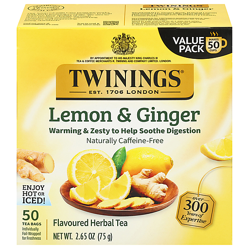Twinings Tea Bags Lemon & Ginger Herbal Tea Value Pack 50 Ea