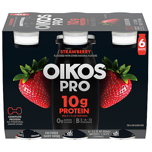 Oikos Pro Shots Strawberry Cultured Dairy Drinks pack a punch with 10g protein per 3.1 fl oz serving to help fuel your muscles and contain complete protein (all nine essential amino acids). Oikos Pro Shots are a good source of vitamin D and calcium for strong bones, and B vitamins (B2, B6, B12) muscles use to support energy production. This dairy drink contains 0g added sugar* per serving and no artificial flavors or colors from artificial sources. Convenient for adding complete protein to your diet every day, these on the go snacks are great for professionals, students and athletes looking for post workout snacks or an addition to protein shakes and smoothies.