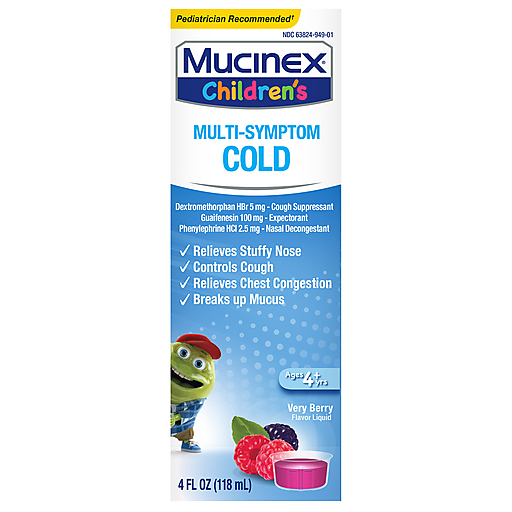 Mucinex Children's Multi-Symptom Cold medicine provides symptom relief for your child so they can get back to being a kid. This kids nasal decongestant, expectorant, and cough suppressant has real active ingredients for real symptom relief. Dextromethorphan HBr helps reduce the impulse to cough and the intensity of coughing. Guaifenesin helps relieve chest congestion and thins & loosens mucus. Phenylephrine HCl provides stuffy nose relief. This very berry flavored children's cough and cold medicine may be used day or night for symptom relief. Mucinex Children's Multi-Symptom Cold liquid helps relieve kids' cough to help them get to sleep, which means you'll both be happier in the morning. Trust the #1 Pediatrician Recommended Brand (among Non-Homeopathic Children’s Cough / Cold OTC products, IQVIA, ProVoice Survey, May 2023). This product contains 4 Fl Oz with one dosing cup. For kids 4 years of age and older. ACTIVE INGREDIENTS: Dextromethorphan HBr 5 mg - Cough Suppressant Guaifenesin 100 mg - Expectorant Phenylephrine HCl 2.5 mg - Nasal Decongestant Looking for cold and flu medicine for adults? Mucinex offers a wide range of cough, cold and flu medicine products for adults and kids. Stock up & be prepared for all those daycare & school bugs your little one is bound to bring home.