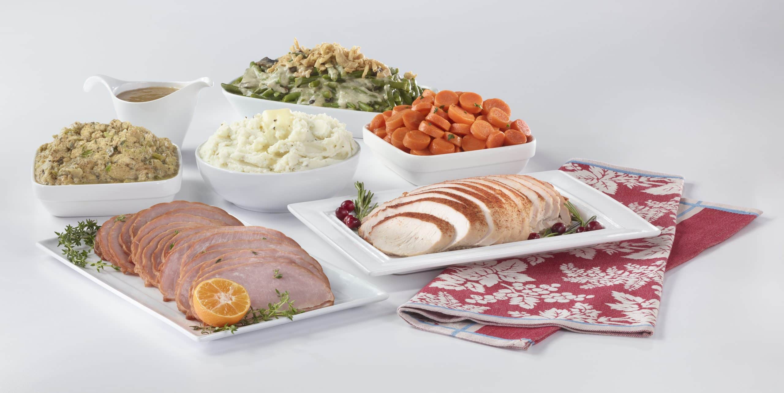• 5 sides (Creamy Mashed Potatoes, Homestyle Gravy, Homestyle Celery Stuffing, Green Bean Mushroom Casserole, Cranberry Relish)